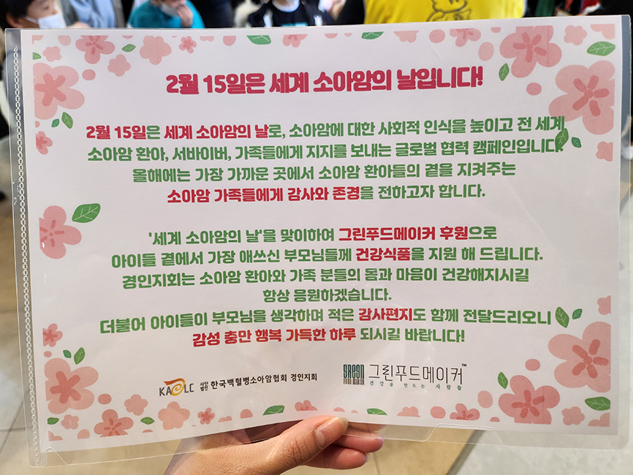 Çѱ¹ ¹éÇ÷º´ ¼Ò¾Æ¾Ï Çùȸ °æÀÎÁöȸ Áö¿ø ±×¸°Çªµå¸ÞÀÌÄ¿´Â '¼¼°è ¼Ò¾Æ¾ÏÀÇ ³¯'À» ¸ÂÀÌÇÏ¿© ¼Ò¾Æ¾Ï ȯ¾Æµé°ú °¡Á·À» ÃÊ´ëÇÏ¿© Ãß¾ïÀ» ¼±¹°Çß½À´Ï´Ù. Çà»ç ÄÁ¼ÁÀÎ '±×µéÀÇ ¼ÕÀ¸·Î(Through their hands)'¿¡ µû¶ó, °¡Àå °¡±î¿î °÷¿¡¼ ȯ¾ÆµéÀ» µ¹ºÁÁÖ´Â ¼Ò¾Æ¾Ï ȯ¾Æ °¡Á·µé¿¡°Ô Á÷Á¢ ÀÛ¼ºÇÑ ÆíÁö·Î °¨»çÀÇ ¸¶À½À», ±×¸°Çªµå¸ÞÀÌÄ¿ÀÇ À¯»ê±Õ Á¦Ç°À» ÈÄ¿øÇÔÀ¸·Î½á ½ÅüÀû °Ç°À» ¼±¹°Çß½À´Ï´Ù. ![]() ![]() ¶ÇÇÑ, ±×¸°Çªµå¸ÞÀÌÄ¿ ÀÓÁ÷¿øÀÌ Âü¿©ÇÏ¿© ȯ¾ÆµéÀÇ ÀͽºÆ®¸² ½ºÆ÷Ã÷ ³îÀÌ Ã¼Çè°ú Ȱ±âÂ÷°í Áñ°Å¿î ¿¡³ÊÁö ¹ß»êÀ» Áö¿øÇϰí, °¡Á·µéÀº ¿µÈ °ü¶÷°ú ¿©°¡»ýȰÀ» ÅëÇØ È޽İú Èú¸µÀÇ ½Ã°£À» °¡Áú ¼ö ÀÖµµ·Ï Áö¿øÇß½À´Ï´Ù. ![]() ±×¸°Çªµå¸ÞÀÌÄ¿´Â Áö¼ÓÀûÀÎ »çȸ°øÇåÀ¸·Î ¼Ò¾Æ¾Ï ȯ¾Æµé°ú °¡Á·µéÀÇ ½ÅüÀû, Á¤½ÅÀû, »çȸÀû °Ç°À» ÈÄ¿øÇϰí ÀÀ¿øÇϵµ·Ï ÇϰڽÀ´Ï´Ù. |